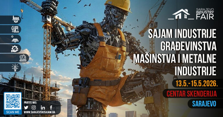 Privredna/Gospodarska komora FBiH Vas poziva da se prezentirate na specijaliziranom industrijskom sajmu u Bosni i Hercegovini, Međunarodnom industrijskom sajmu, sajmu energije, građevinarstva, mašinstva i metalne industrije “SARAJEVO INDUSTRY FAIR – SIF”. Sajam se održava u terminu 13.05. – 15.05.2026. godine u Centru Skenderija, Sarajevo.