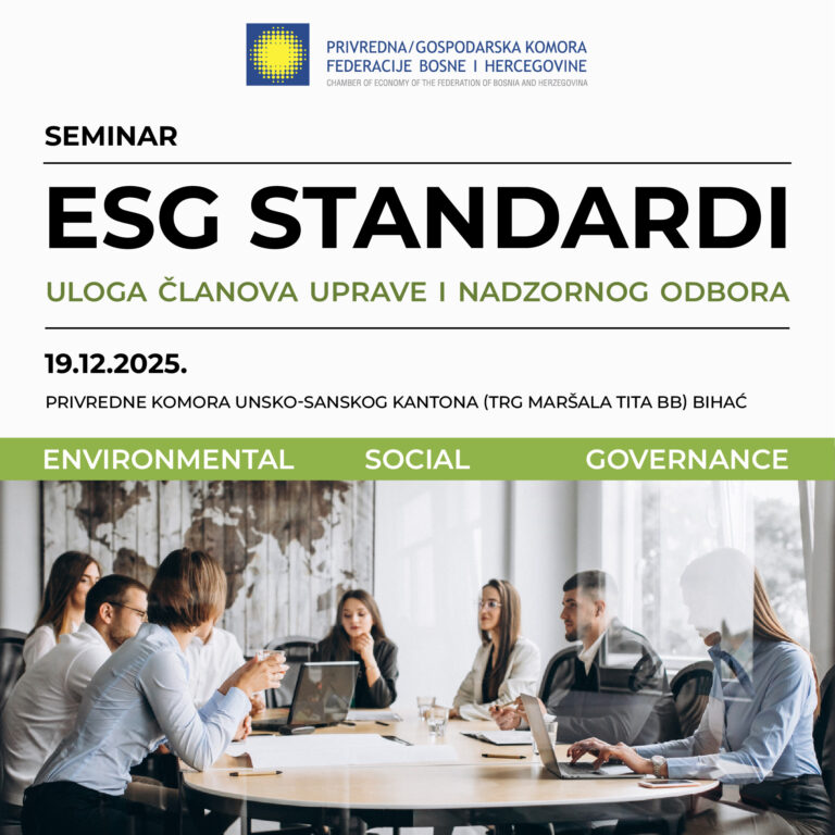 Privredna/Gospodarska komora FBiH u suradnji s Privrednom komorom Unsko-sanskog kantona Vas pozivaju da uzmete učešće na seminaru ESG standardi poslovanja za članove nadzornih odbora i uprava društava petak, 19.12.2025. godine u prostorijama Privredne komora Unsko-sanskog kantona (Trg maršala Tita bb,) Bihać.