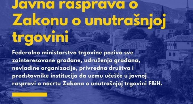 Federalno ministarstvo trgovine otvorilo je javnu raspravu o Zakonu o unutrašnjoj trgovini, nakon što su oba doma Parlamenta Federacije Bosne i Hercegovine usvojila Nacrt zakona. Javne rasprave bit će organizovane u pet gradova Federacije BiH, a prva će biti održana 6. juna u Mostaru, u prostorijama Privredne komore. U saopćenju Federalno […]