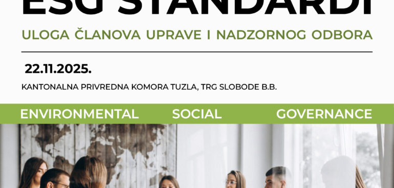 Kontinuirana edukacija certificiranih polaznika usavršavanja članova NO i uprava – Seminar “ESG standardi – uloga članova uprave i nadzornog odbora” – Tuzla, 22.11.2025. godine U skladu s Uredbom o usavršavanju predsjednika i članova nadzornih odbora i uprava privrednih društava sa učešćem državnog kapitala (“Službene novine F BiH”, br. 71/09, 33/10, 23/11, […]