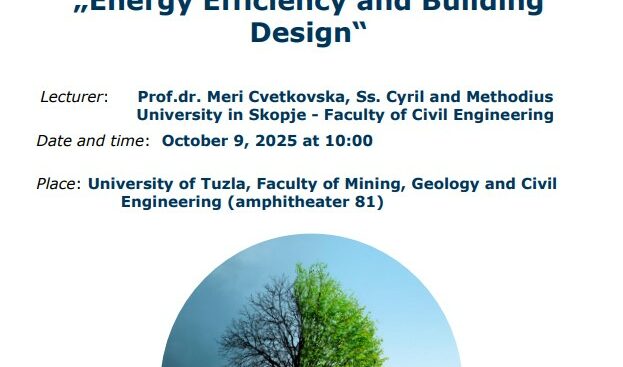 Rudarsko-geološko-građevinski fakultet Univerziteta u Tuzli, u okviru Erasmus+ projekta 1FUTURE, najavljuje početak realizacije aktivnosti Kancelarije za klimatske promjene i održivost – TMSIC (Tailor Made Short Intensive Course). Pozivamo studente I i II ciklusa studija, nastavno osoblje, saradnike, te profesionalce iz ove oblasti da se pridruže uvodnim sesijama kursa “Održiva energija, građevinarstvo […]