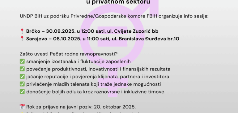 Javni poziv za uvođenje rodno osjetljivog standarda otvoren je 10. septembra 2025. godine. Kako bismo kompanijama približili detalje i proces uvođenja Pečata rodne ravnopravnosti, UNDP BiH uz podršku Privredne/Gospodarske komore FBIH organizuje info sesije: Brčko – 30.09.2025. u 12:00 sati, ul. Cvijete Zuzorić bb Sarajevo – 08.10.2025. u 11:00 sati, ul. Branislava Đurđeva br.10 Registracija […]