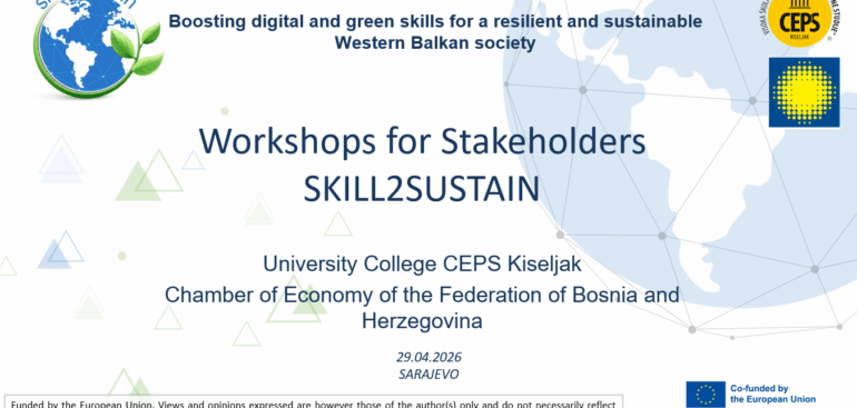 Visoka škola „CEPS – Centar za poslovne studije“ Kiseljak i Privredna/Gospodarska komora Federacije Bosne i Hercegovine, u okviru Erasmus+ Capacity Building projekta SKILL2SUSTAIN, organizuju radionicu posvećenu jačanju digitalnih i zelenih kompetencija. Pozivamo predstavnike akademske zajednice, privrede, javnog sektora i ostalih relevantnih dionika da prisustvuju SKILL2SUSTAIN radionici, koja će se održati 29. […]