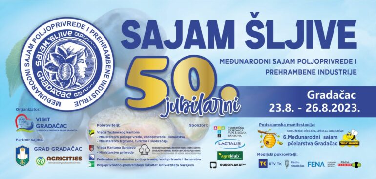 Obavještavamo Vas da će se u periodu od 23. do 26.08.2023. godine održati 50. jubilarni Međunarodni sajam poljoprivrede i prehrambene industrije Sajam šljive u Gradačcu. Program sajma možete preuzeti putem link ispod, a za detaljnije informacije molimo da posjetite: https://gradacackisajam.ba/ Program Sajma