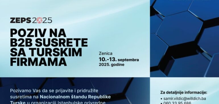 Privredna komora Federacije Bosne i Hercegovine u saradnji sa Willdich Business Centrom i Istanbulskom privrednom komorom poziva privrednike Bosne i Hercegovine da uzmu učešće na B2B susretima koji će biti upriličeni u periodu od 10. do 13. septembra 2025. godine u toku održavanja sajma ZEPS 2025 u Zenici. Ukoliko ste zainteresovani […]