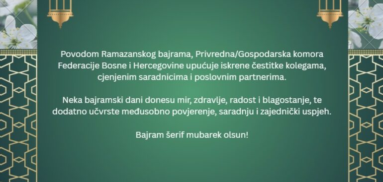 Privredna/Gospodarska komora Federacije BiH obavještava: Ovim putem Vas želimo podsjetiti da će se konferencija „CBAM i zelena tranzicija industrije u Bosni i Hercegovini“ održati dana 31.03.2026. godine u zgradi Vlade Federacije BiH. Nadamo se da ste već rezervisali navedeni datum u svom kalendaru te da ćete se odazvati pozivu i prisustvovati […]