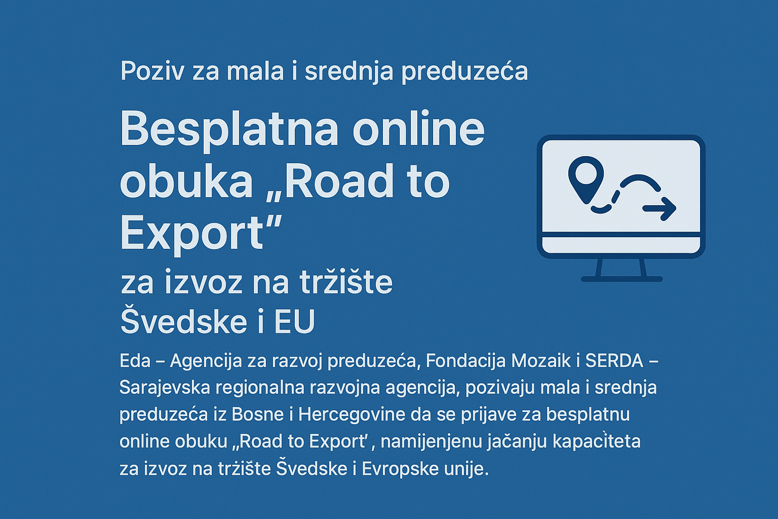 Eda – Agencija za razvoj preduzeća, Fondacija Mozaik i SERDA – Sarajevska regionalna razvojna agencija pozivaju mala i srednja preduzeća iz Bosne i Hercegovine da se prijave za besplatnu online obuku „Road to Export“, namijenjenu jačanju kapaciteta za izvoz na tržište Švedske i Evropske unije.