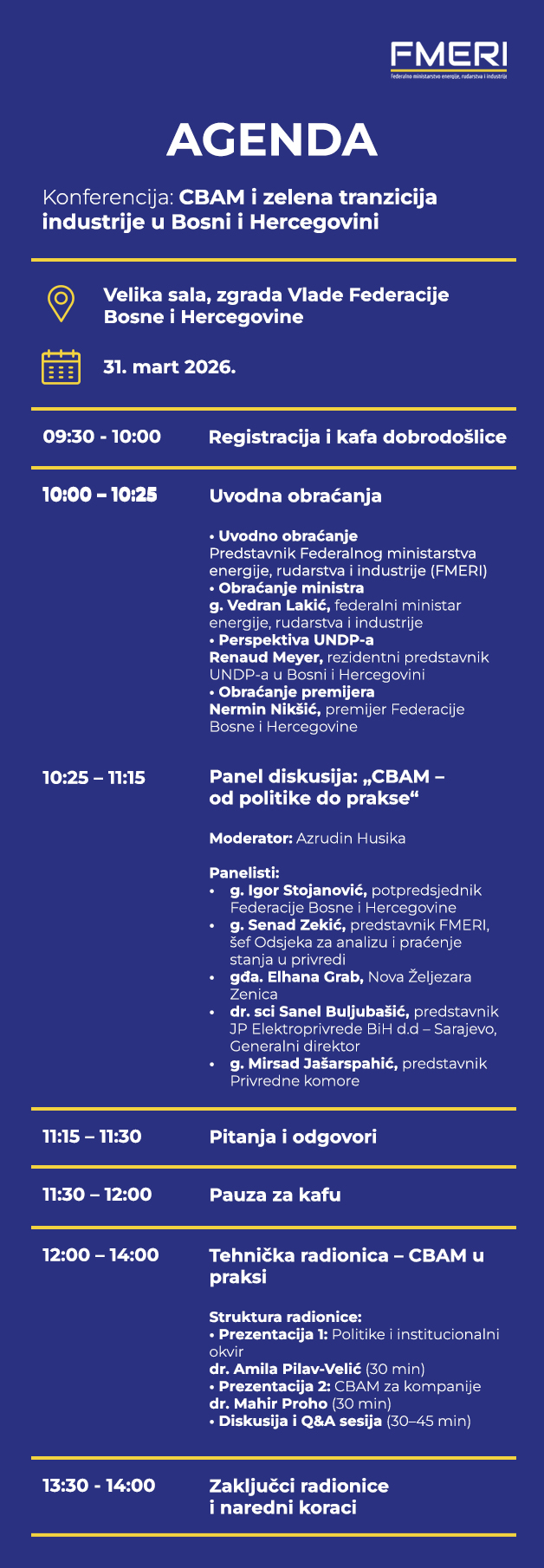 Ovim putem Vas želimo podsjetiti da će se konferencija „CBAM i zelena tranzicija industrije u Bosni i Hercegovini“ održati dana 31.03.2026. godine u zgradi Vlade Federacije BiH.